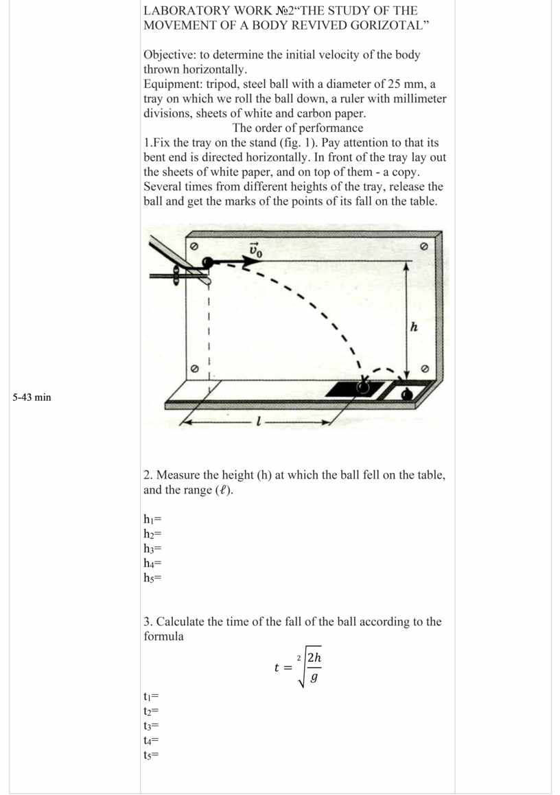 t1= t2= t3= t4= t5= 4. Use the obtained data to calculate the horizontal velocity of the ball according to the formula ϑ0 = 5. Rolling the ball on the tray from the same place, repeat the experiment several times and record the measurement results in table №1: