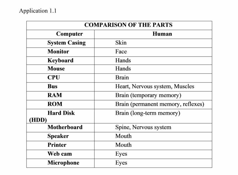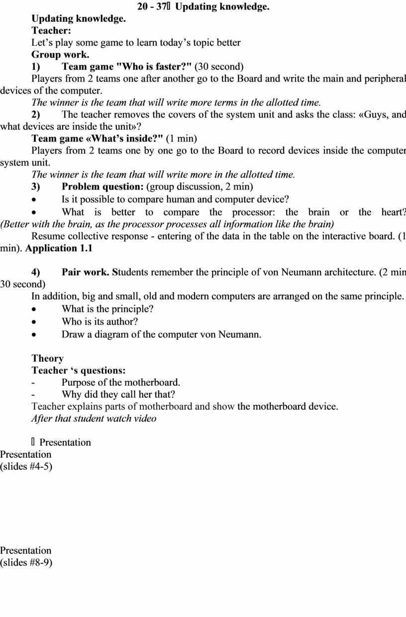 Updating knowledge. Teacher: Let’s play some game to learn today’s topic better Group work. 1) Team game "Who is faster?" (30 second) Players from 2 teams one after another go to the Board and write the main and peripheral devices of the computer. The winner is the team that will write more terms in the allotted time. 2) The teacher removes the covers of the system unit and asks the class: «Guys, and what devices are inside the unit»? Team game «What’s inside?" (1 min) Players from 2 teams one by one go to the Board to record devices inside the computer system unit. The winner is the team that will write more in the allotted time. 3) Problem question: (group discussion, 2 min) · Is it possible to compare human and computer device? ·