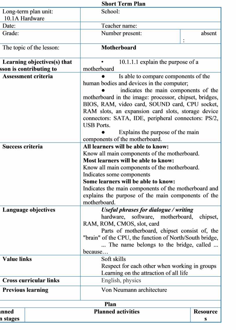 All learners will be able to know: Know all main components of the motherboard. Most learners will be able to know: Know all main components of the motherboard. Indicates some components Some learners will be able to know: Indicates the main components of the motherboard and explains the purpose of the main components of the motherboard. |