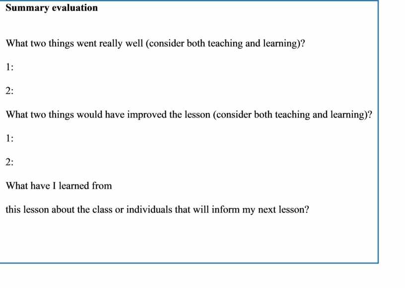 Were the lesson objectives/learning objectives realistic? Did all learners achieve the LO? If not, why? Did my planned differentiation work well? Did I stick to timings? What changes did I make from my plan and why?