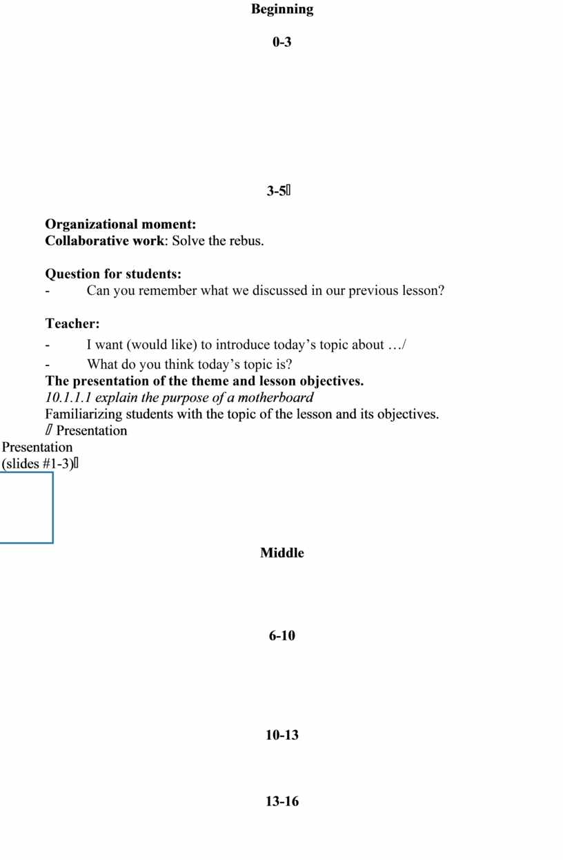 Teacher: - I want (would like) to introduce today’s topic about …/ - What do you think today’s topic is? The presentation of the theme and lesson objectives. 10.1.1.1 explain the purpose of a motherboard Familiarizing students with the topic of the lesson and its objectives.
