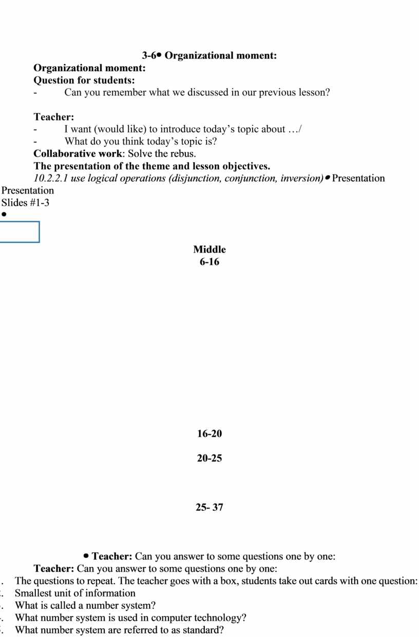 Teacher: Can you answer to some questions one by one: 1. The questions to repeat. The teacher goes with a box, students take out cards with one question: 2. Smallest unit of information 3. What is called a number system? 4. What number system is used in computer technology? 5. What number system are referred to as standard? 6. How to go from decimal to any other number system? 7. How to switch from any number system to decimal system? 8. How does a computer measure information? 9. What are the rules for adding binary numbers? 10. What are the rules for subtracting binary numbers? 11. How can I multiply two binary numbers?