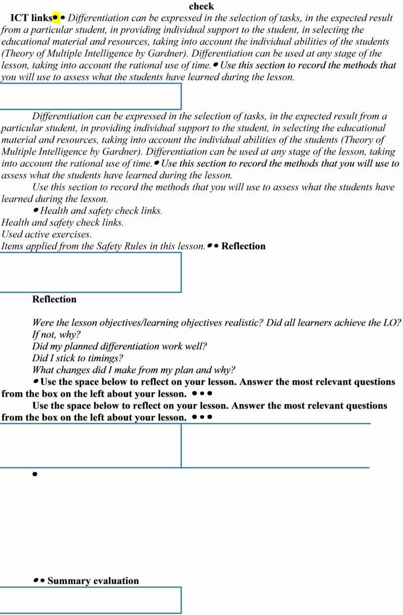 Were the lesson objectives/learning objectives realistic? Did all learners achieve the LO? If not, why? Did my planned differentiation work well? Did I stick to timings? What changes did I make from my plan and why?