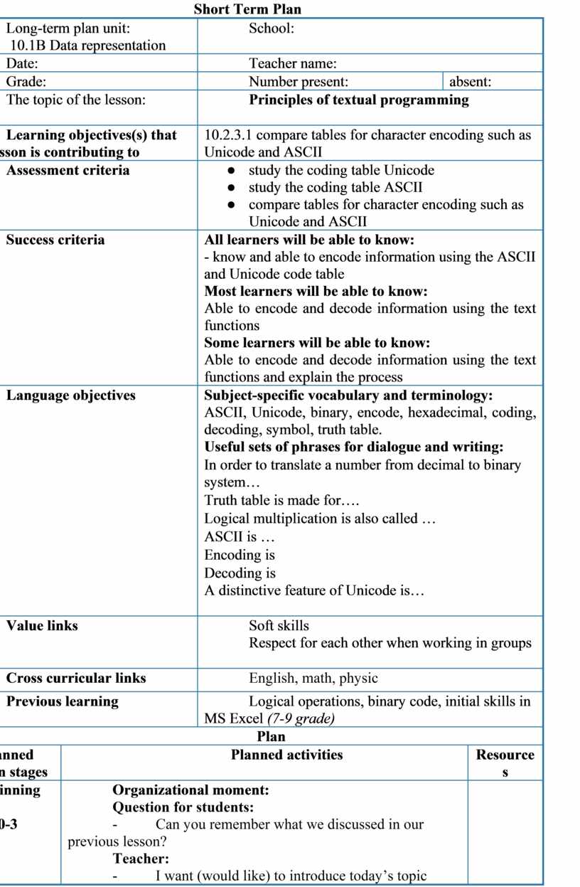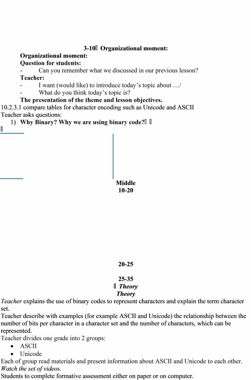 Organizational moment: Question for students: - Can you remember what we discussed in our previous lesson? Teacher: - I want (would like) to introduce today’s topic about …/ - What do you think today’s topic is? The presentation of the theme and lesson objectives. 10.2.3.1 compare tables for character encoding such as Unicode and ASCII Teacher asks questions: 1) Why Binary? Why we are using binary code? |