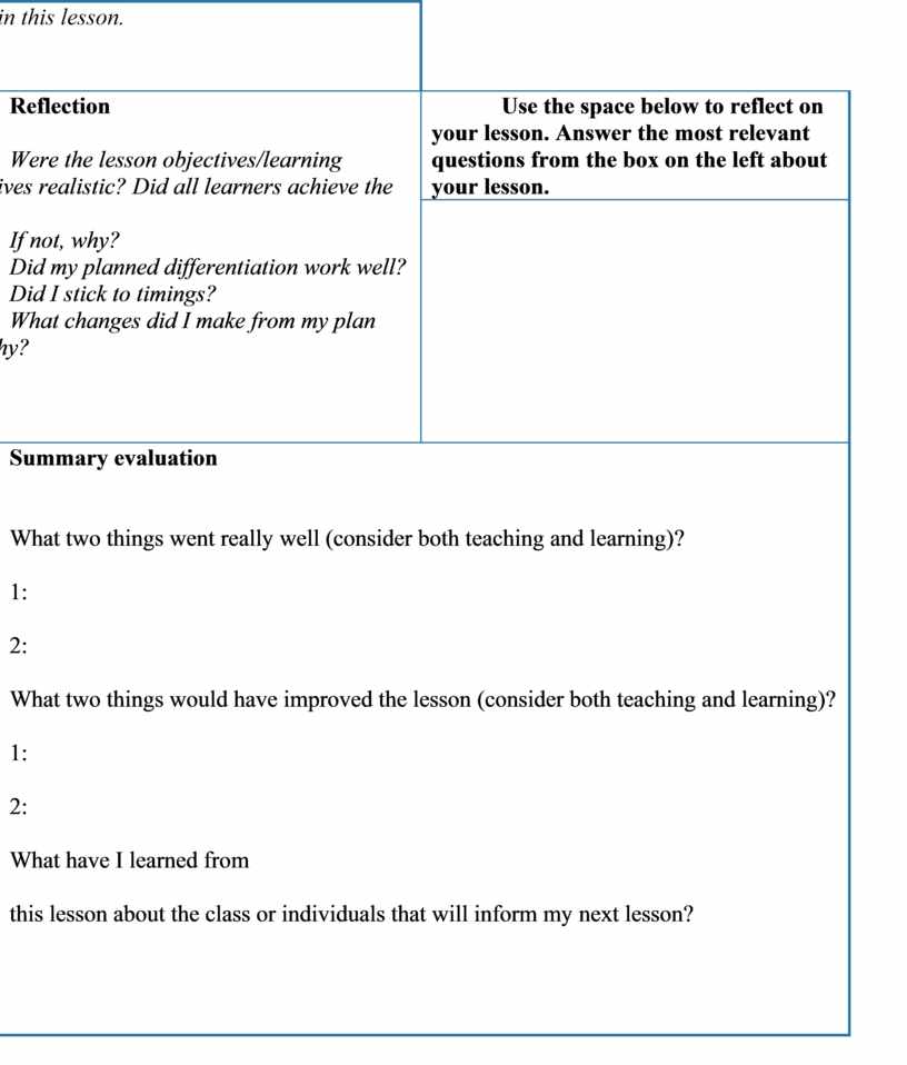 Were the lesson objectives/learning objectives realistic? Did all learners achieve the LO? If not, why? Did my planned differentiation work well? Did I stick to timings? What changes did I make from my plan and why?