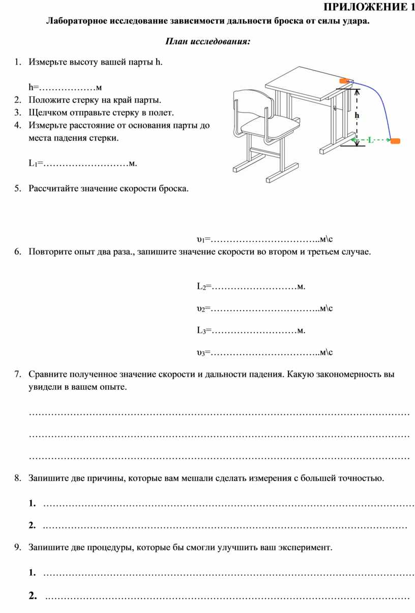 расстояние от парты до лежащей стерки, это величина L. Для исследования нужно повторить опыт 2-3 раза.