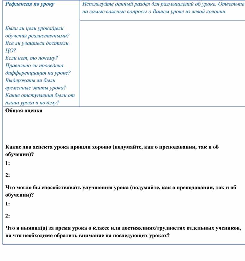 Используйте данный раздел для размышлений об уроке. Ответьте на самые важные вопросы о Вашем уроке из левой колонки. |
