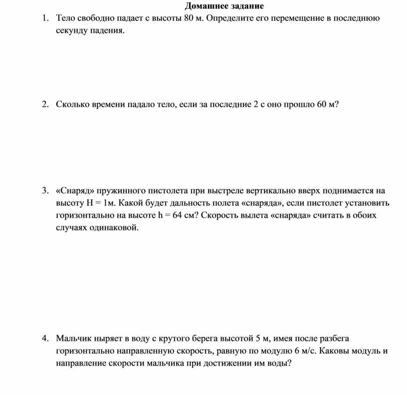 1. Тело свободно падает с высоты 80 м. Определите его перемещение в последнюю секунду падения.