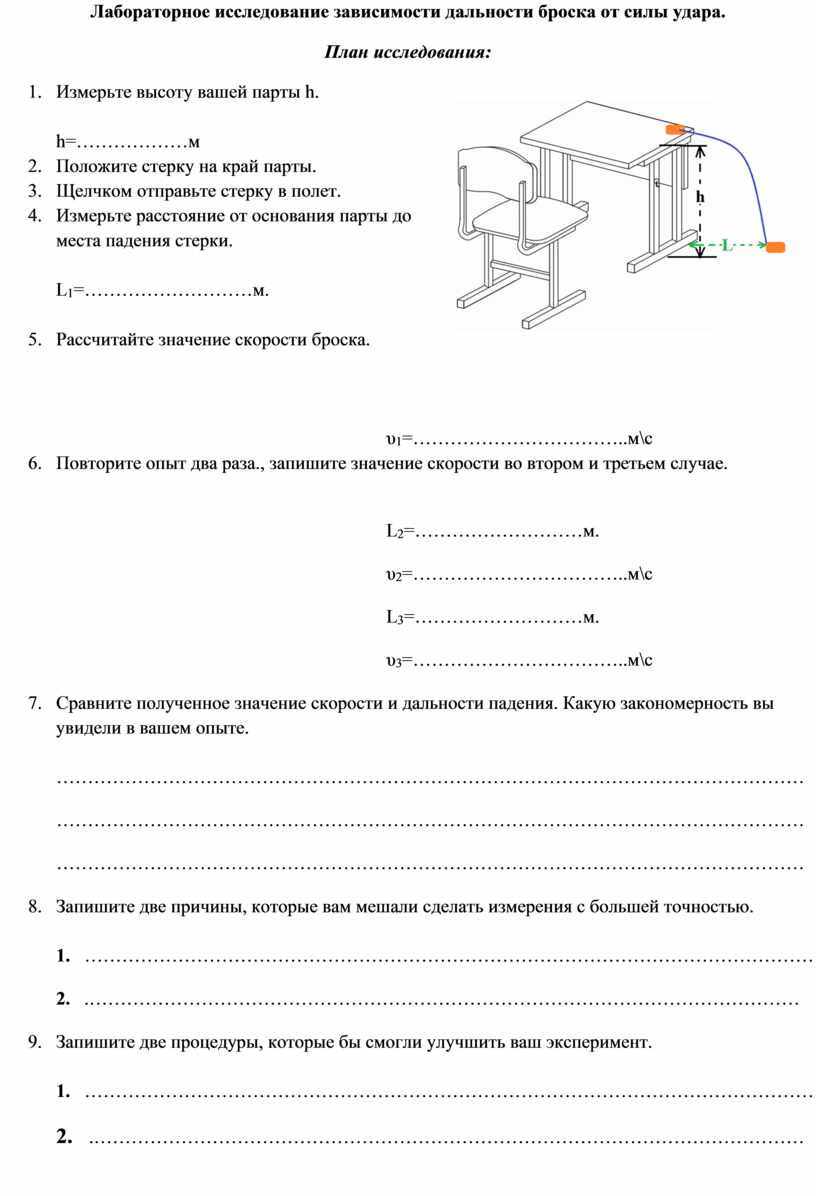 Лабораторное исследование зависимости дальности броска от силы удара.