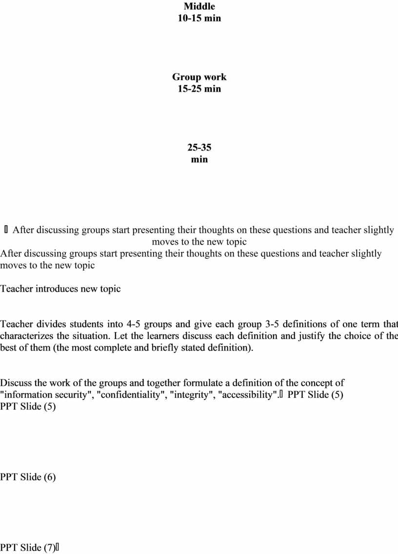 Discuss the work of the groups and together formulate a definition of the concept of "information security", "confidentiality", "integrity", "accessibility". |