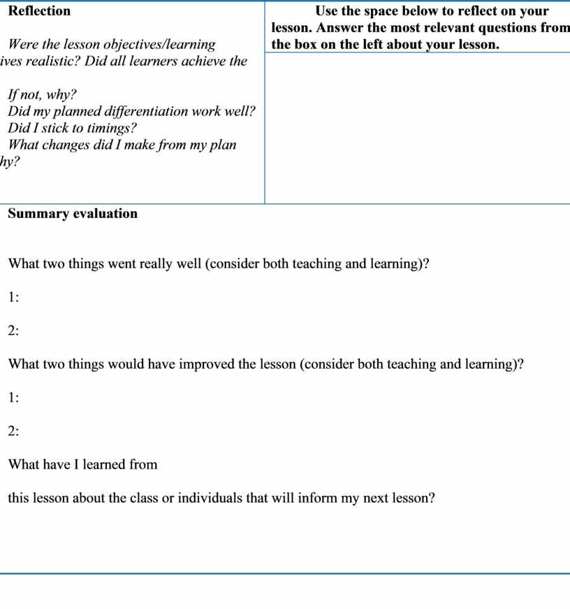 Were the lesson objectives/learning objectives realistic? Did all learners achieve the LO? If not, why? Did my planned differentiation work well? Did I stick to timings? What changes did I make from my plan and why?