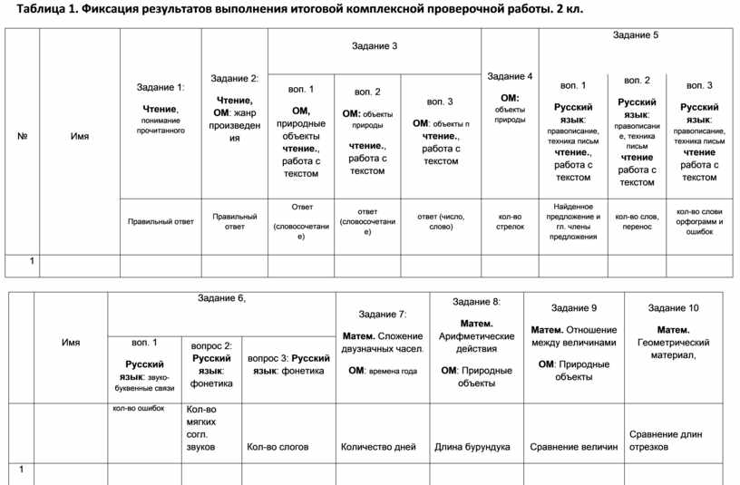Таблица 1. Фиксация результатов выполнения итоговой комплексной проверочной работы. 2 кл.