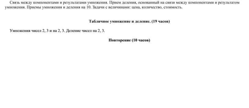 Нахождение суммы нескольких одинаковых слагаемых и представление числа в виде суммы одинаковых слагаемых. Задачи на умножение. Периметр прямоугольника. Умножение единицы и нуля. Название компонентов и результатов умножения. Операция умножения. Переместительное свойство умножения. Конкретный смысл действия деления. Название компонентов и результата деления. Связь между компонентами и результатами умножения. Прием деления, основанный на связи между компонентами и результатом умножения. Приемы умножения и деления на 10. Задачи с величинами: цена, количество, стоимость.