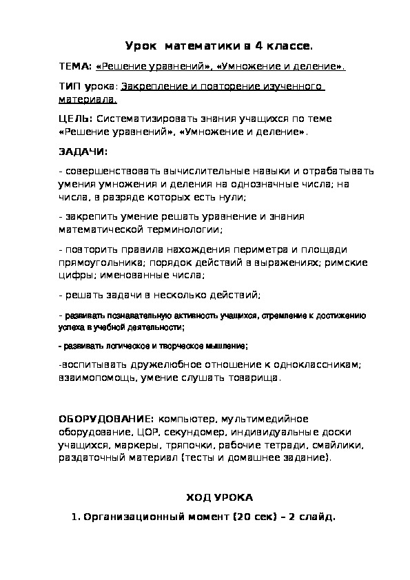 ТЕМА: «Решение уравнений», «Умножение и деление».