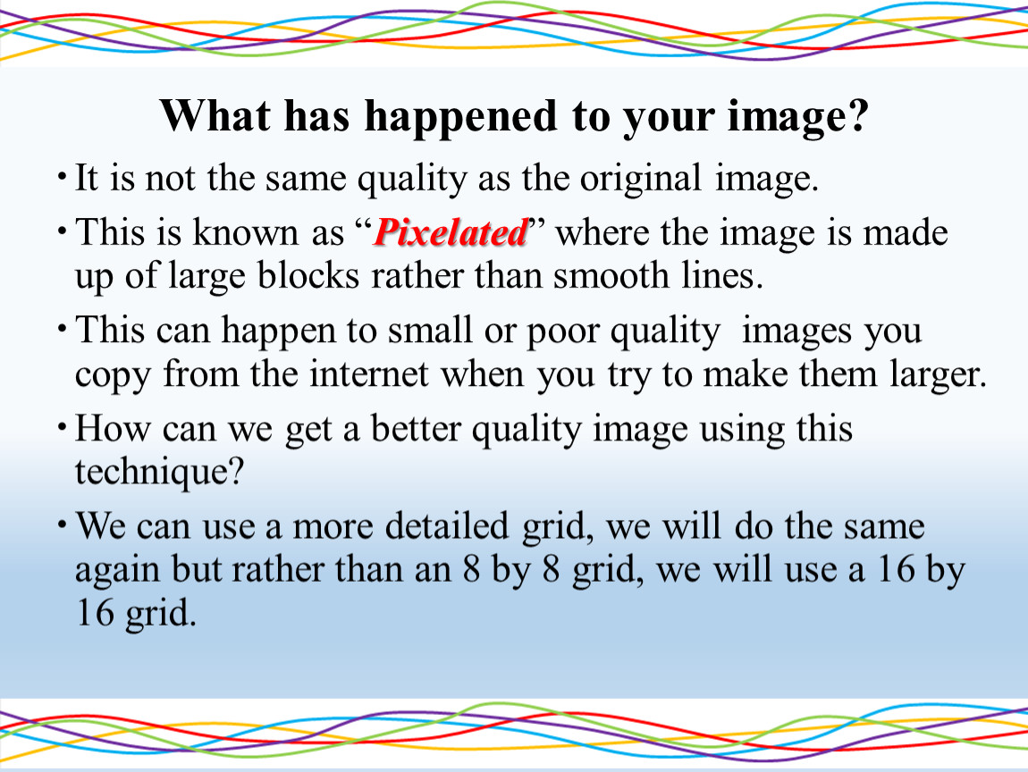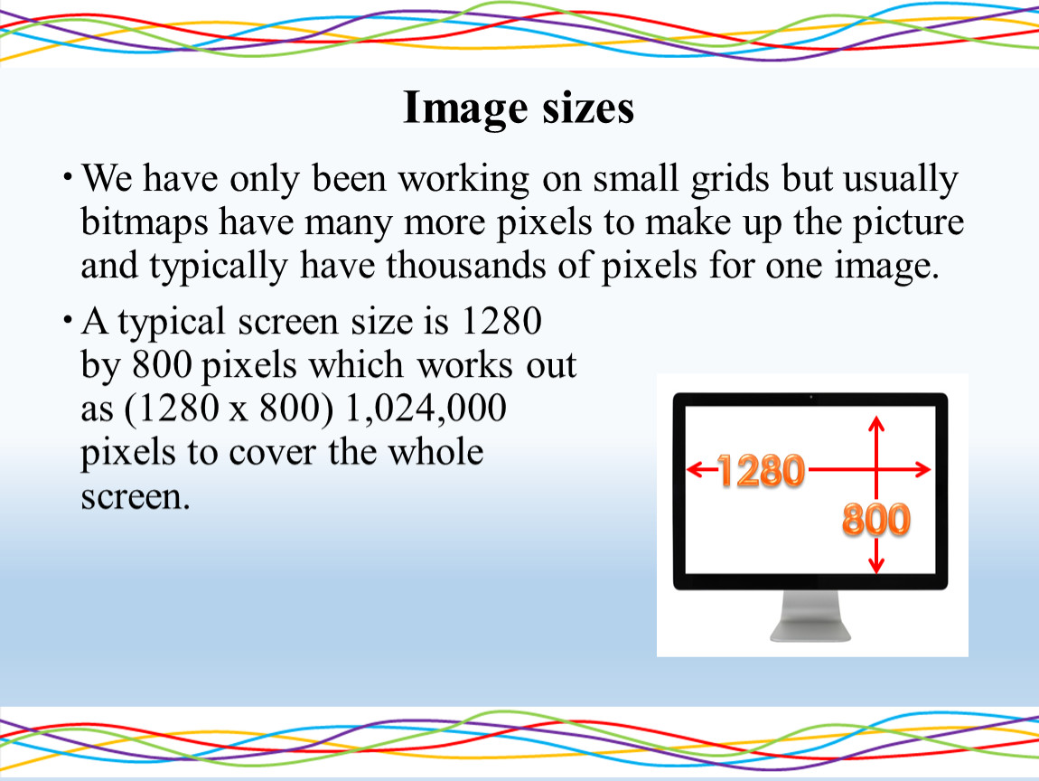 We have only been working on small grids but usually bitmaps have many more pixels to make up the picture and typically have thousands of pixels for one image.