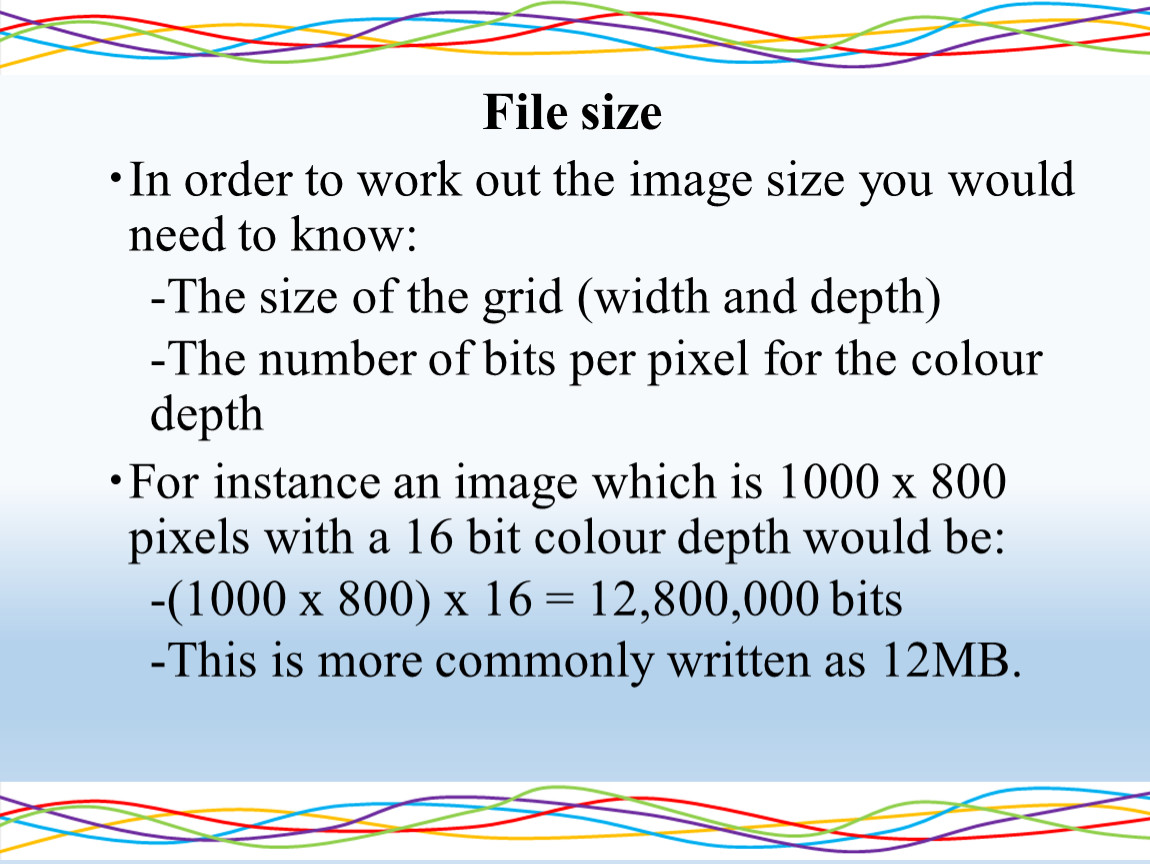 For instance an image which is 1000 x 800 pixels with a 16 bit colour depth would be:
