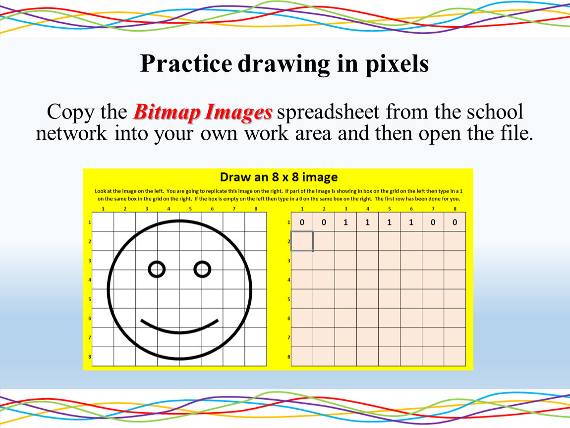 Copy the Bitmap Images spreadsheet from the school network into your own work area and then open the file.