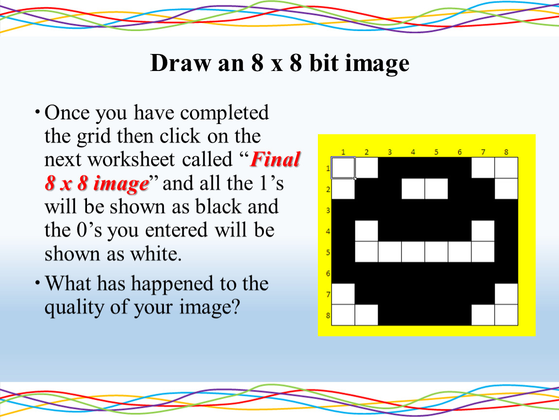 Once you have completed the grid then click on the next worksheet called “Final 8 x 8 image” and all the 1’s will be shown as black and the 0’s you entered will be shown as white.