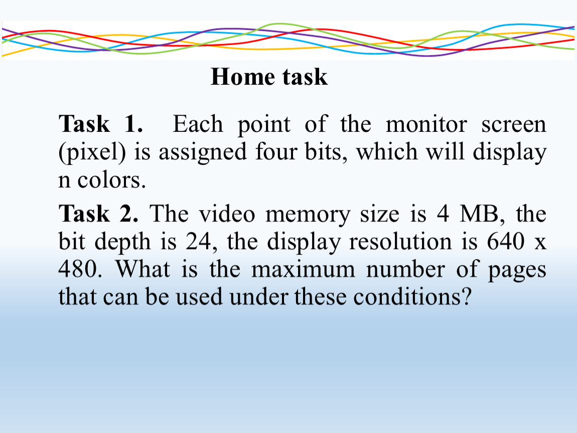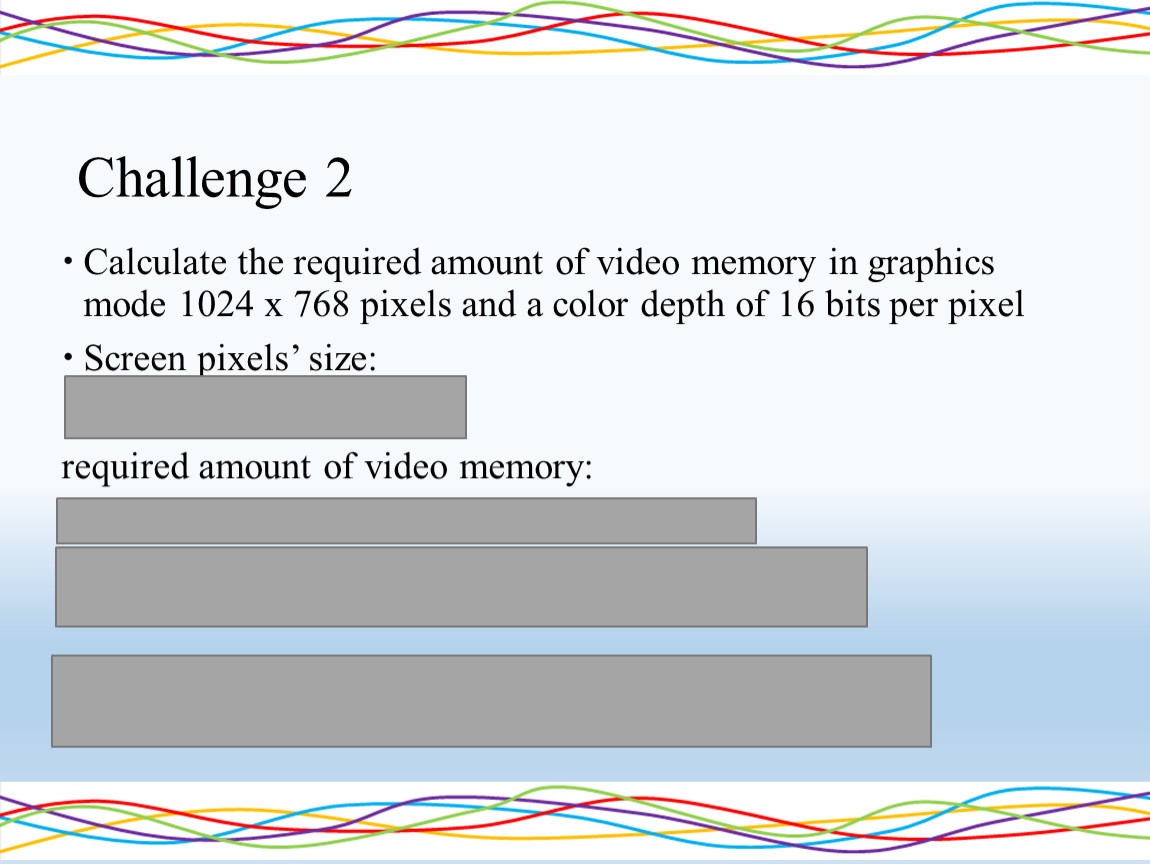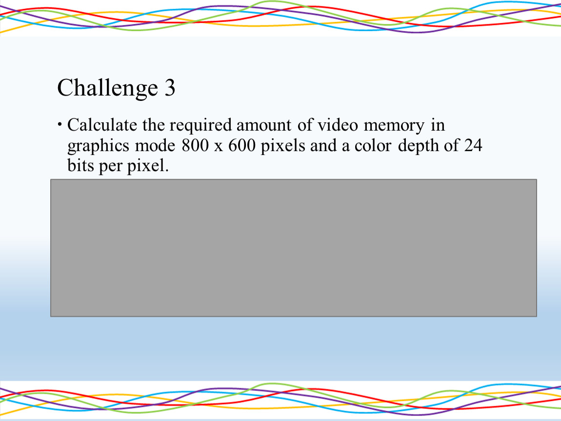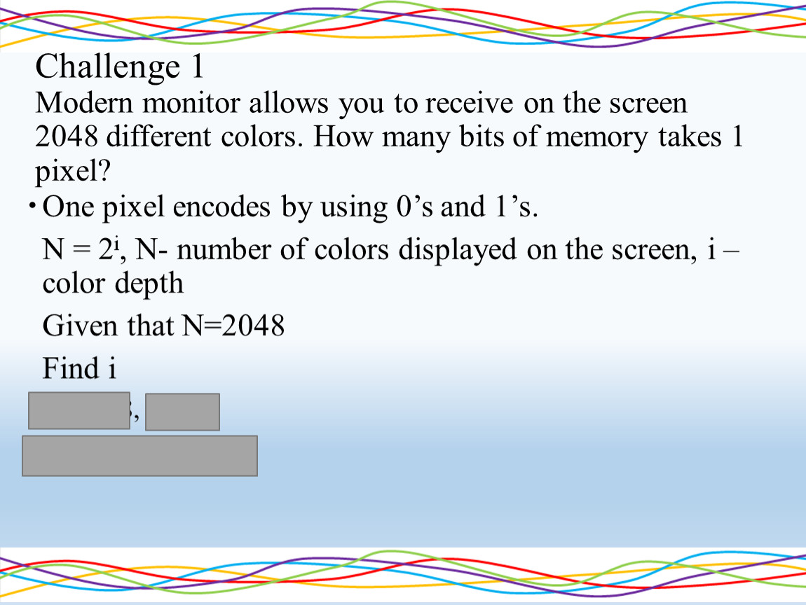 Challenge 1Modern monitor allows you to receive on the screen 2048 different colors. How many bits of memory takes 1 pixel?