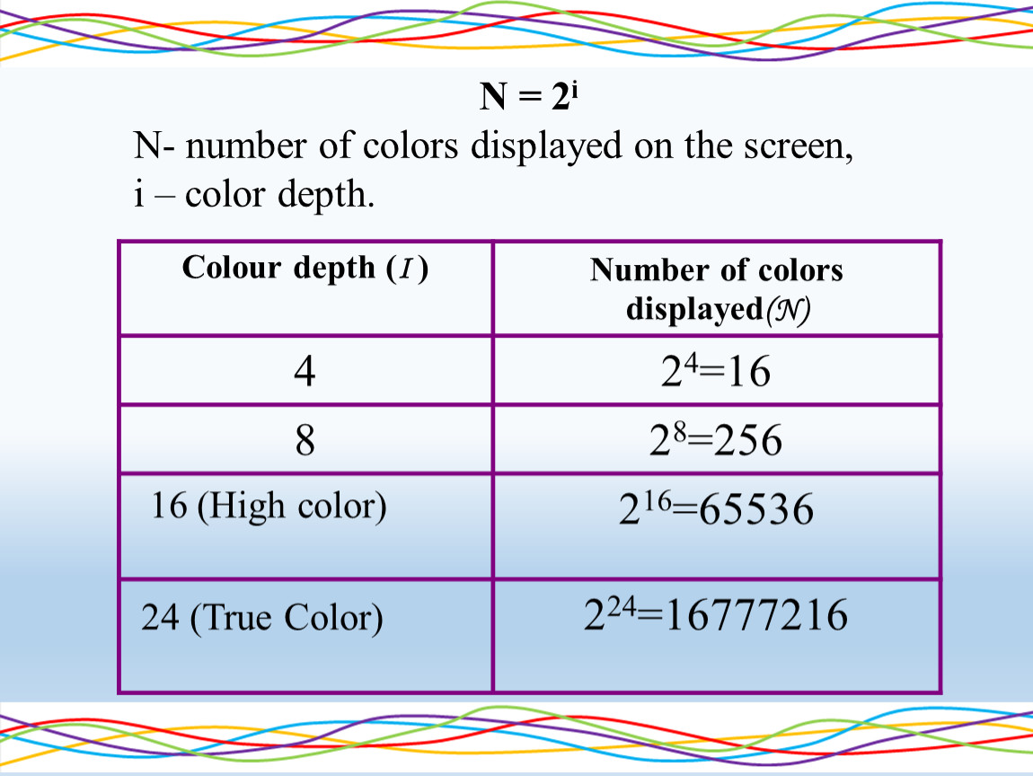 N = 2i, N- number of colors displayed on the screen, i – color depth
