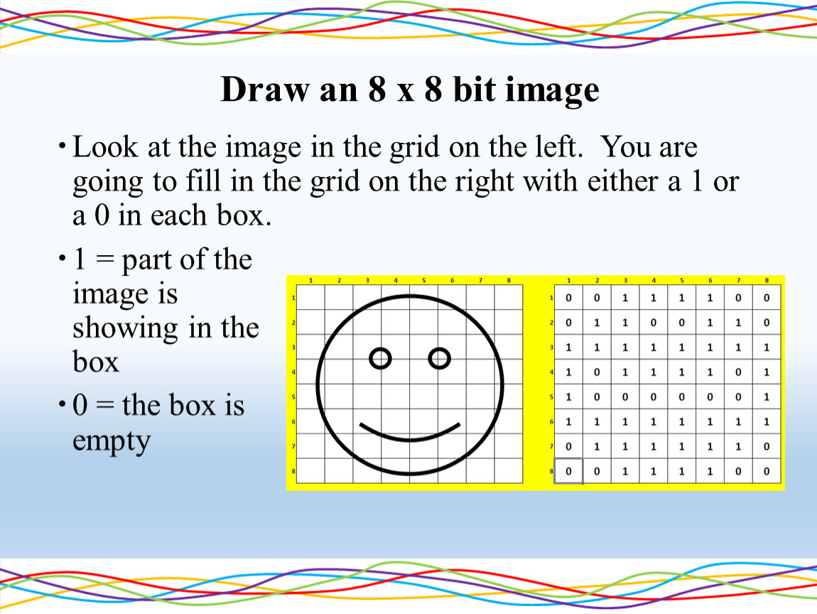 Look at the image in the grid on the left. You are going to fill in the grid on the right with either a 1 or a 0 in each box.