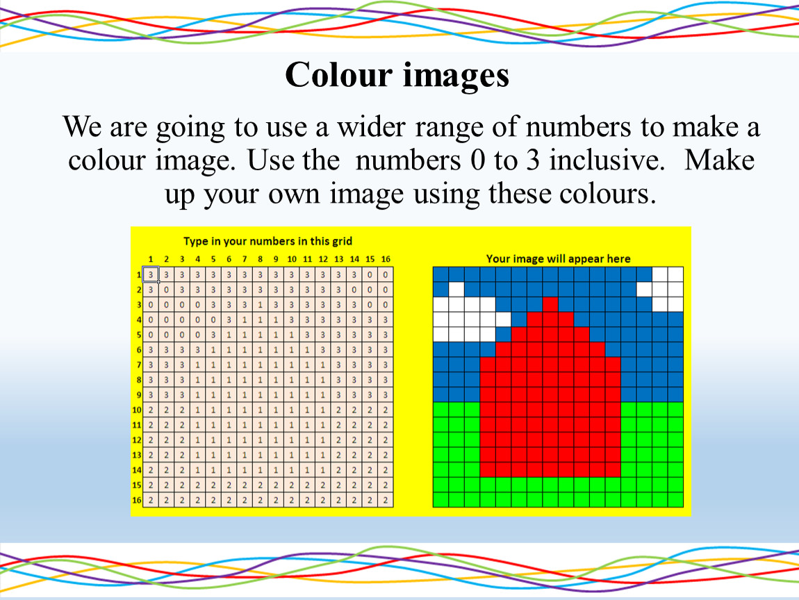 We are going to use a wider range of numbers to make a colour image. Use the numbers 0 to 3 inclusive. Make up your own image using these colours.