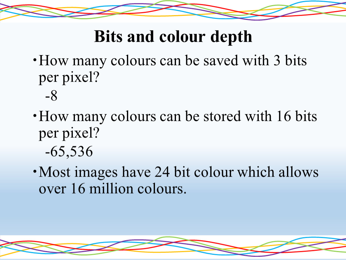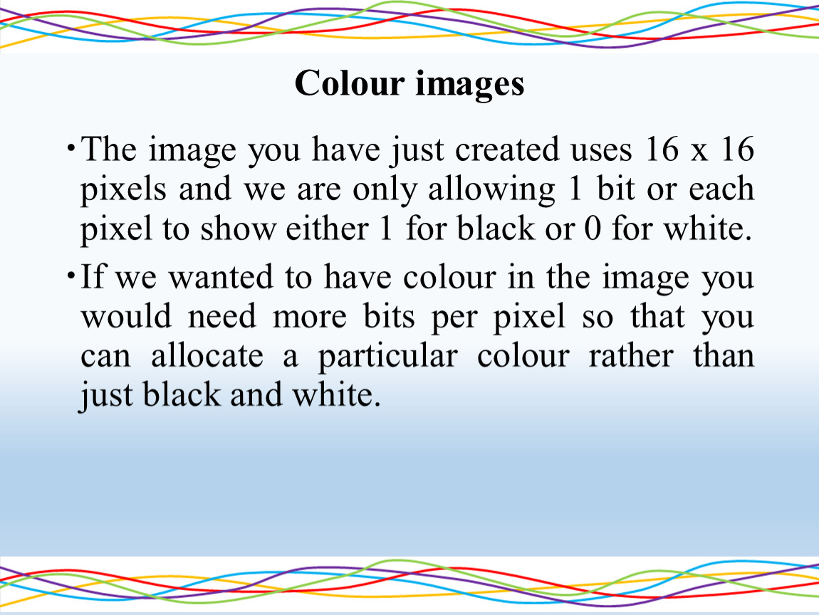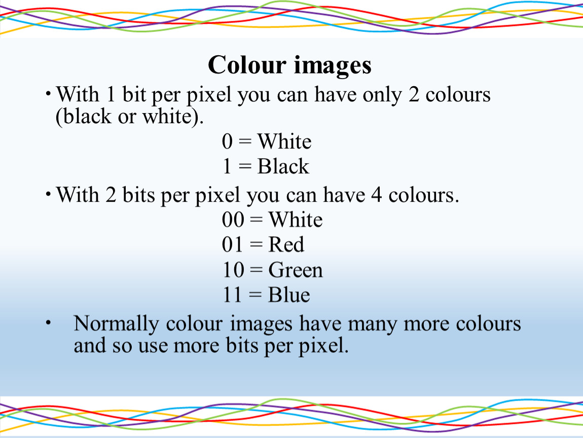 If we wanted to have colour in the image you would need more bits per pixel so that you can allocate a particular colour rather than just black and white.