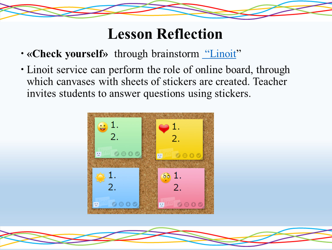 Linoit service can perform the role of online board, through which canvases with sheets of stickers are created. Teacher invites students to answer questions using stickers.