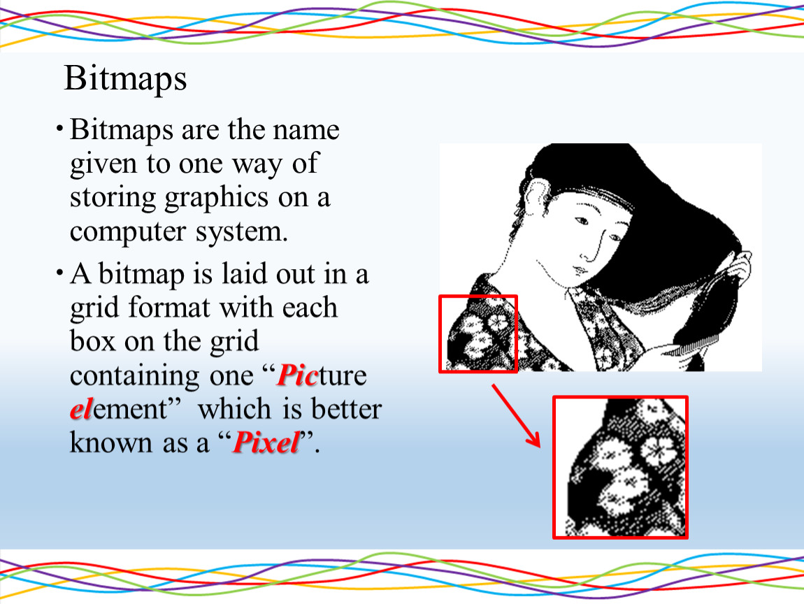 A bitmap is laid out in a grid format with each box on the grid containing one “Picture element” which is better known as a “Pixel”.