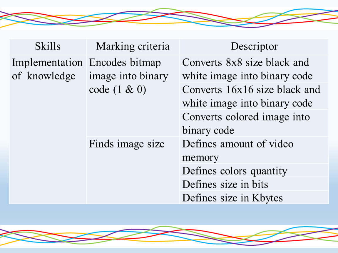 Implementation of knowledge | Encodes bitmap image into binary code (1 & 0) | Converts 8x8 size black and white image into binary code |