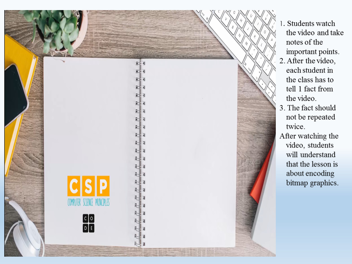 After watching the video, students will understand that the lesson is about encoding bitmap graphics.