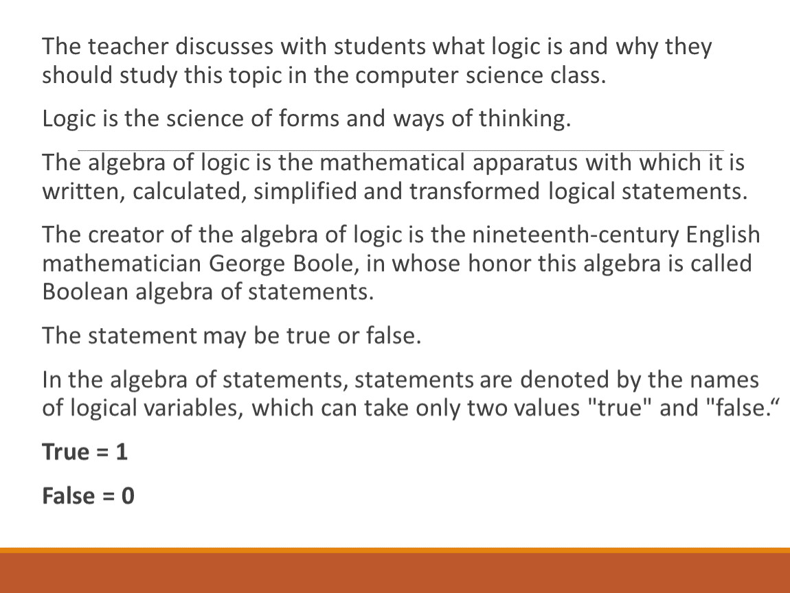 The algebra of logic is the mathematical apparatus with which it is written, calculated, simplified and transformed logical statements.