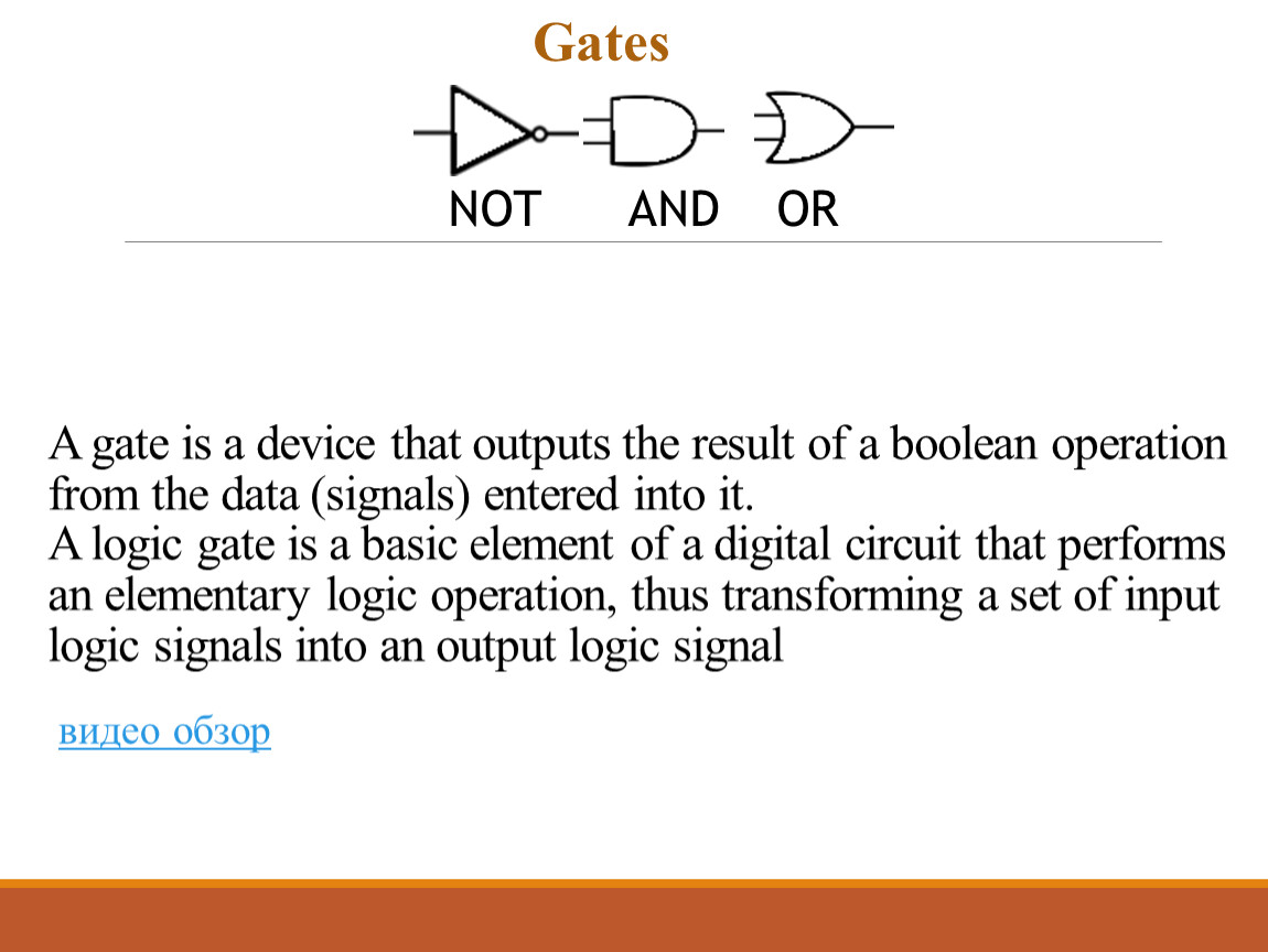 A gate is a device that outputs the result of a boolean operation from the data (signals) entered into it.A logic gate is a basic element of a digital circuit that performs an elementary logic operation, thus transforming a set of input logic signals into an output logic signal