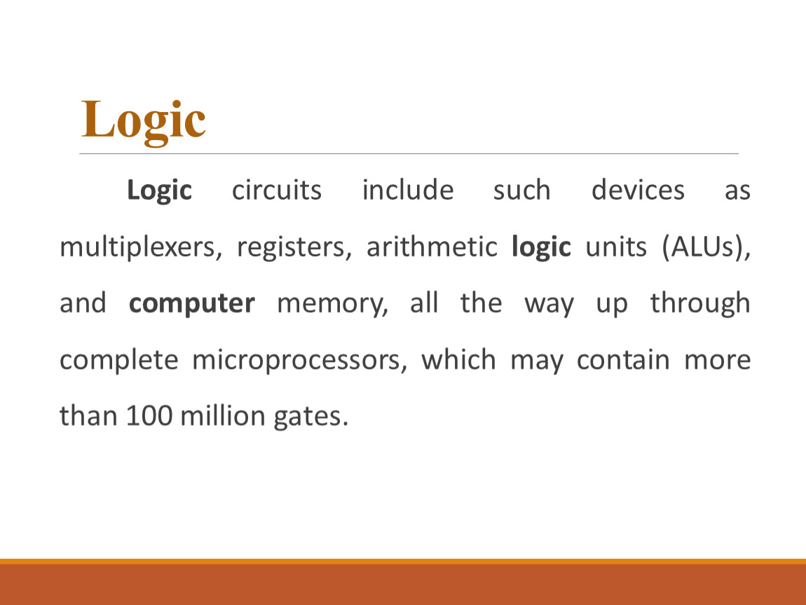 Logic circuits include such devices as multiplexers, registers, arithmetic logic units (ALUs), and computer memory, all the way up through complete microprocessors, which may contain more than 100 million gates.