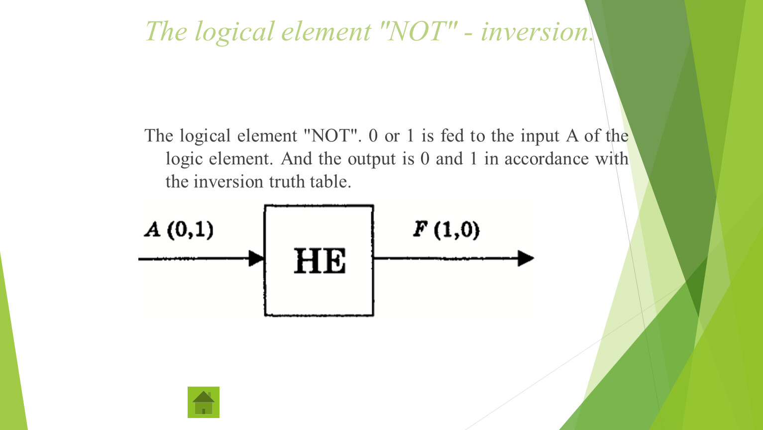 The logical element "NOT". 0 or 1 is fed to the input A of the logic element. And the output is 0 and 1 in accordance with the inversion truth table.