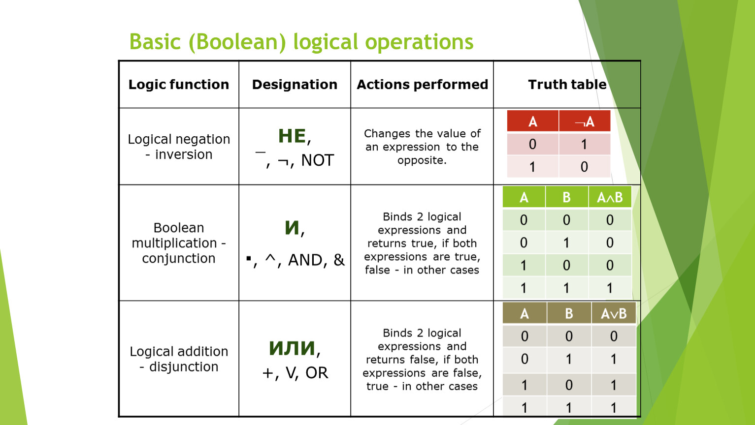 Boolean multiplication - conjunction | И, | Binds 2 logical expressions and returns true, if both expressions are true, false - in other cases | |
