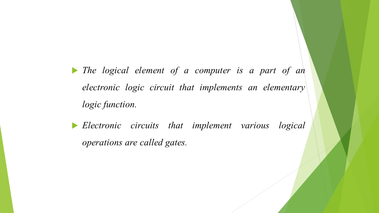 The logical element of a computer is a part of an electronic logic circuit that implements an elementary logic function.