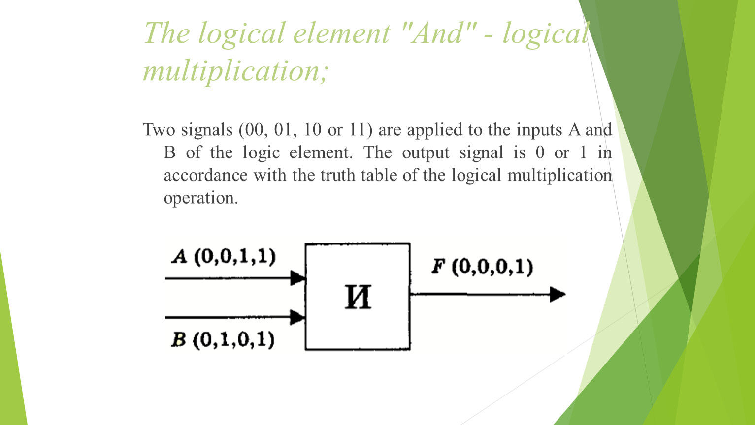 Two signals (00, 01, 10 or 11) are applied to the inputs A and B of the logic element. The output signal is 0 or 1 in accordance with the truth table of the logical multiplication operation.