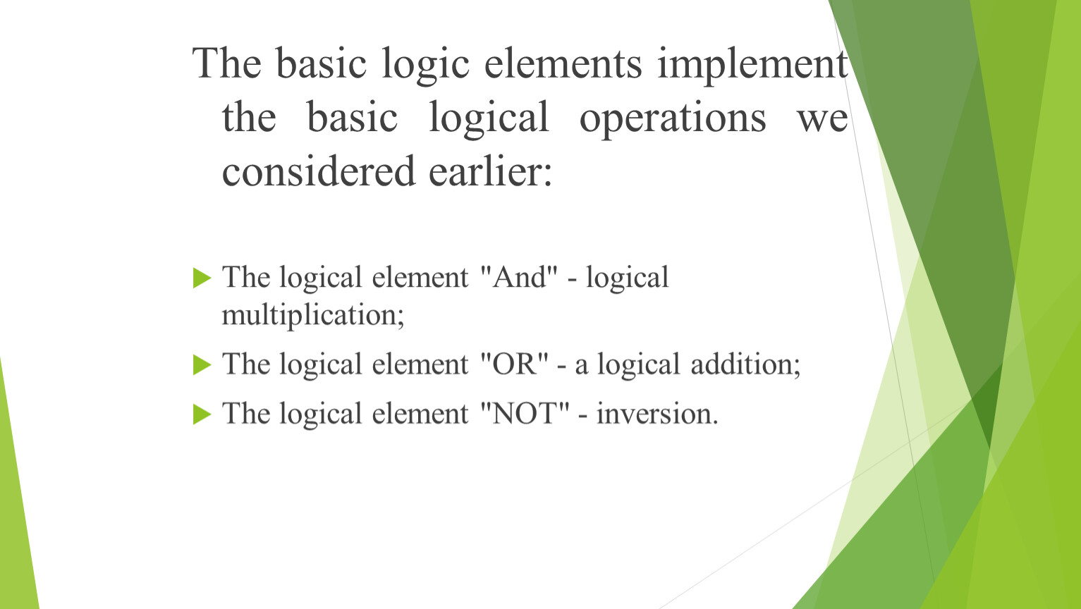 The basic logic elements implement the basic logical operations we considered earlier: