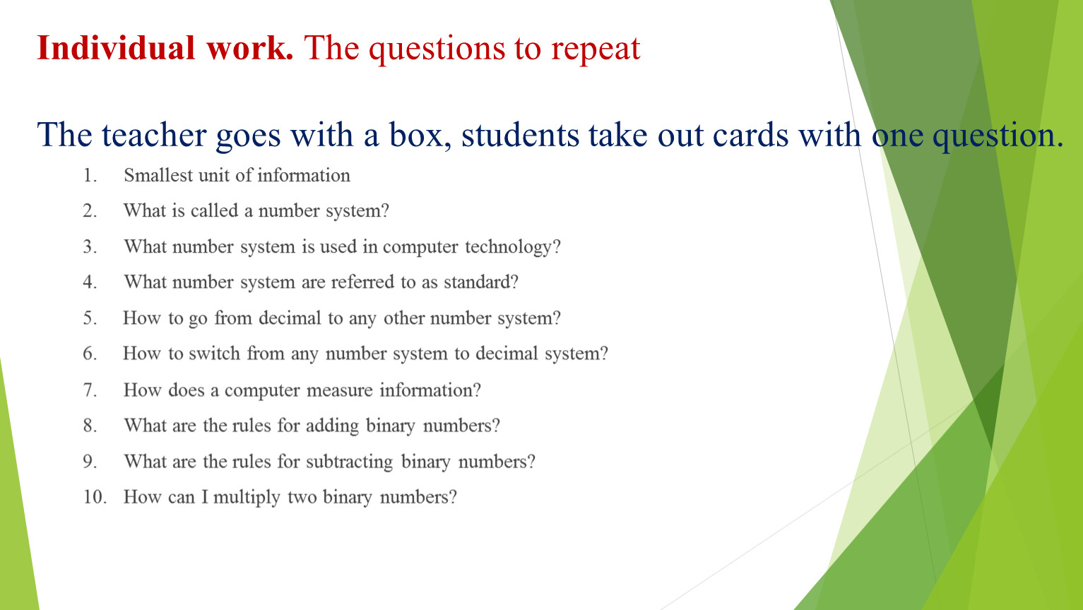 Individual work. The questions to repeatThe teacher goes with a box, students take out cards with one question.