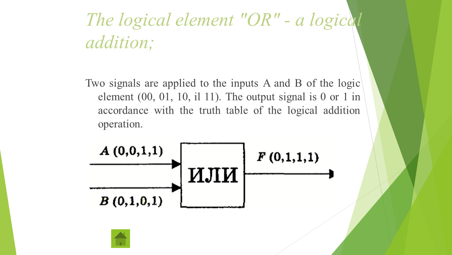 Two signals are applied to the inputs A and B of the logic element (00, 01, 10, il 11). The output signal is 0 or 1 in accordance with the truth table of the logical addition operation.