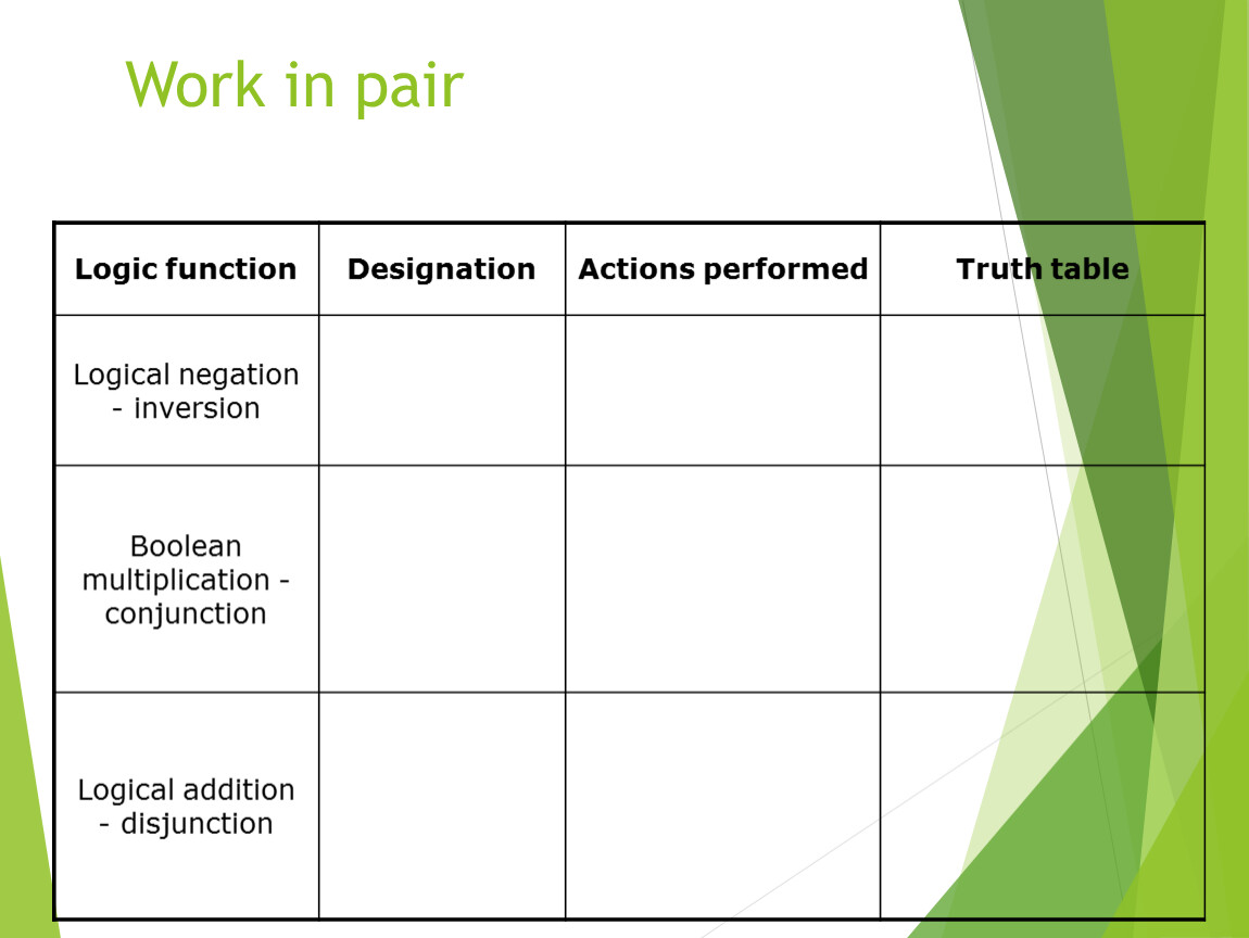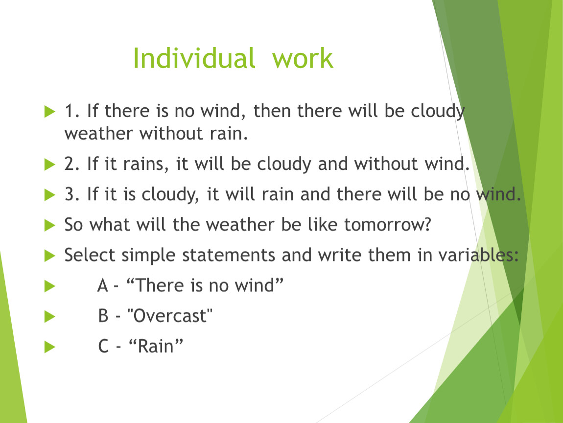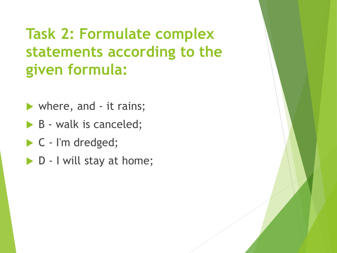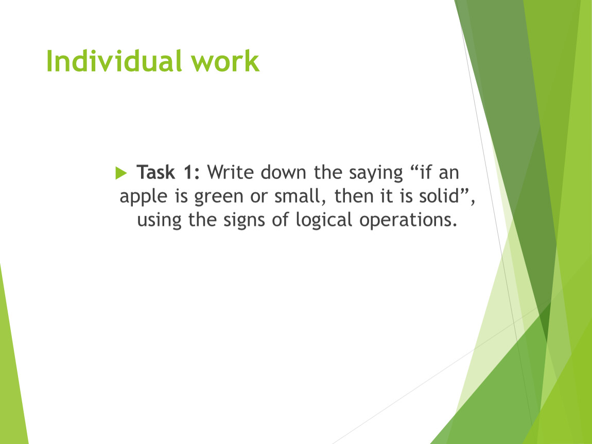 Task 1: Write down the saying “if an apple is green or small, then it is solid”, using the signs of logical operations.