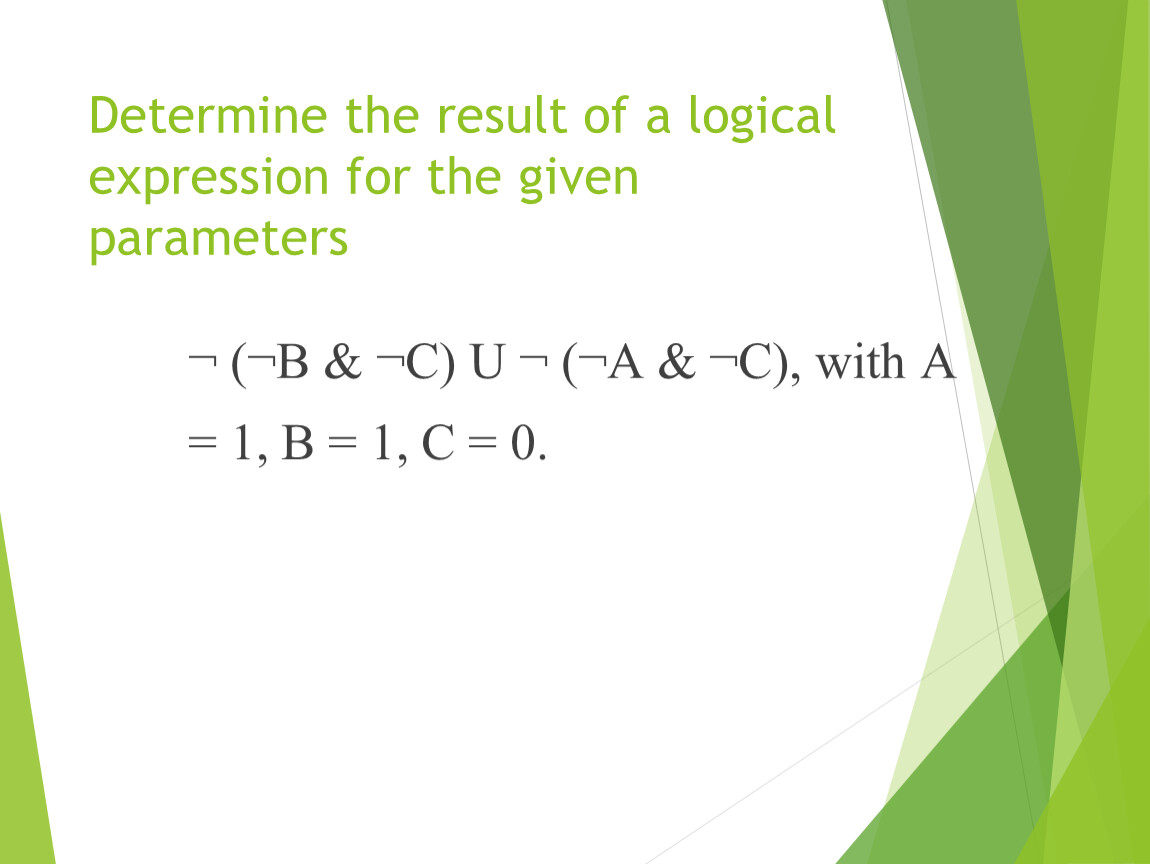 ¬ (¬B & ¬C) U ¬ (¬A & ¬C), with A = 1, B = 1, C = 0.