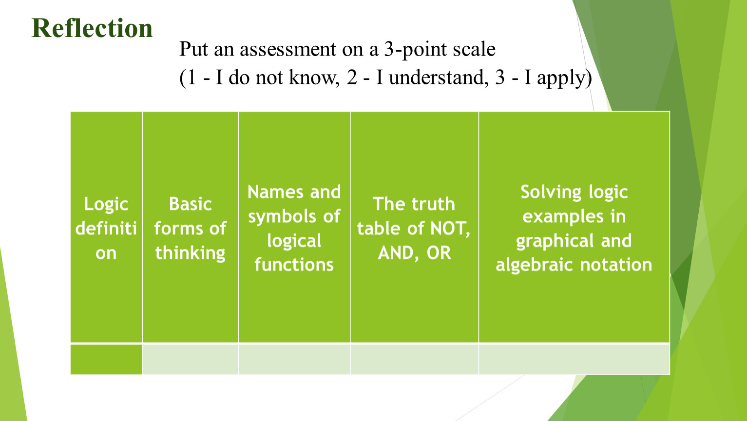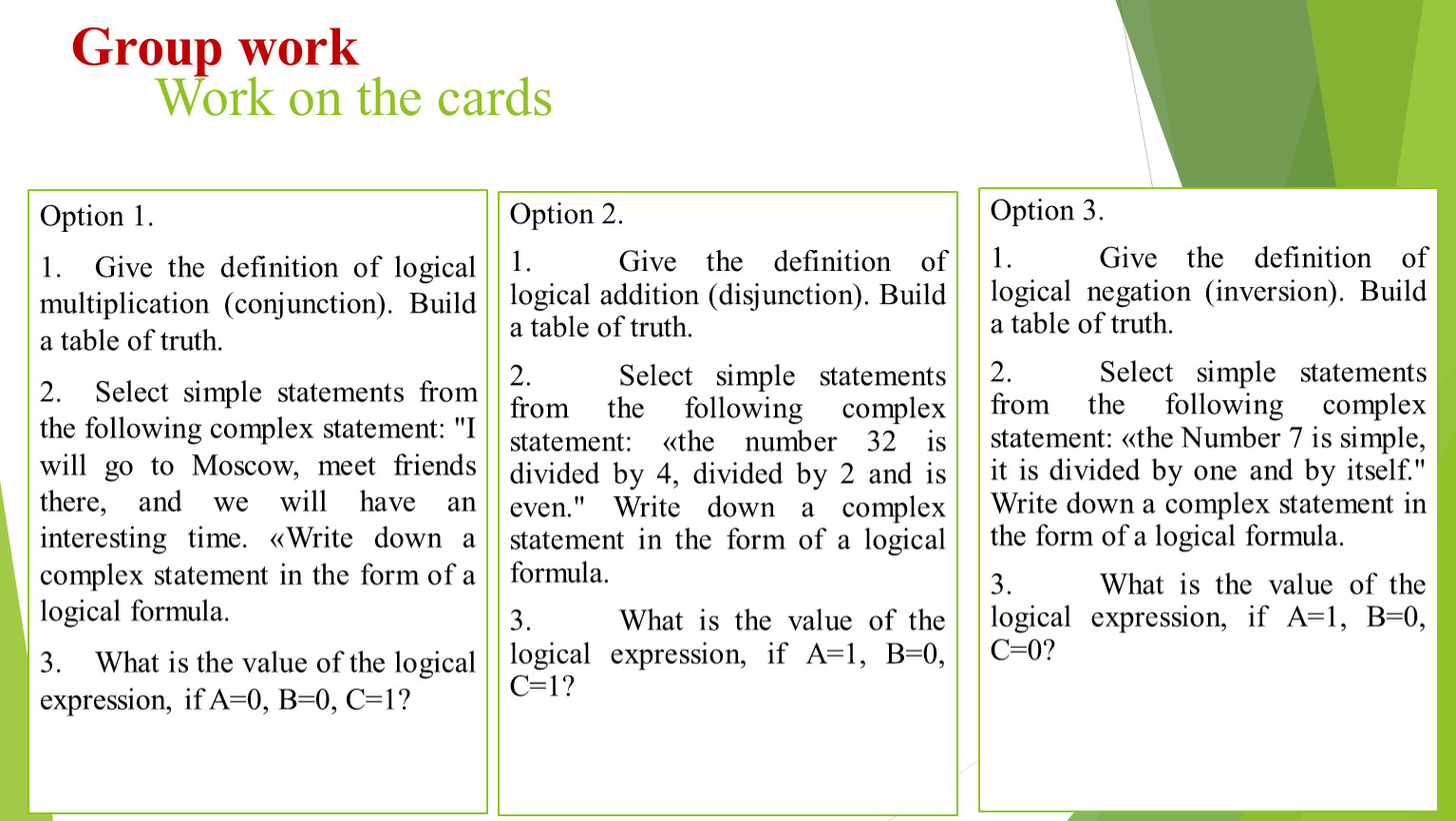 1. Give the definition of logical addition (disjunction). Build a table of truth.