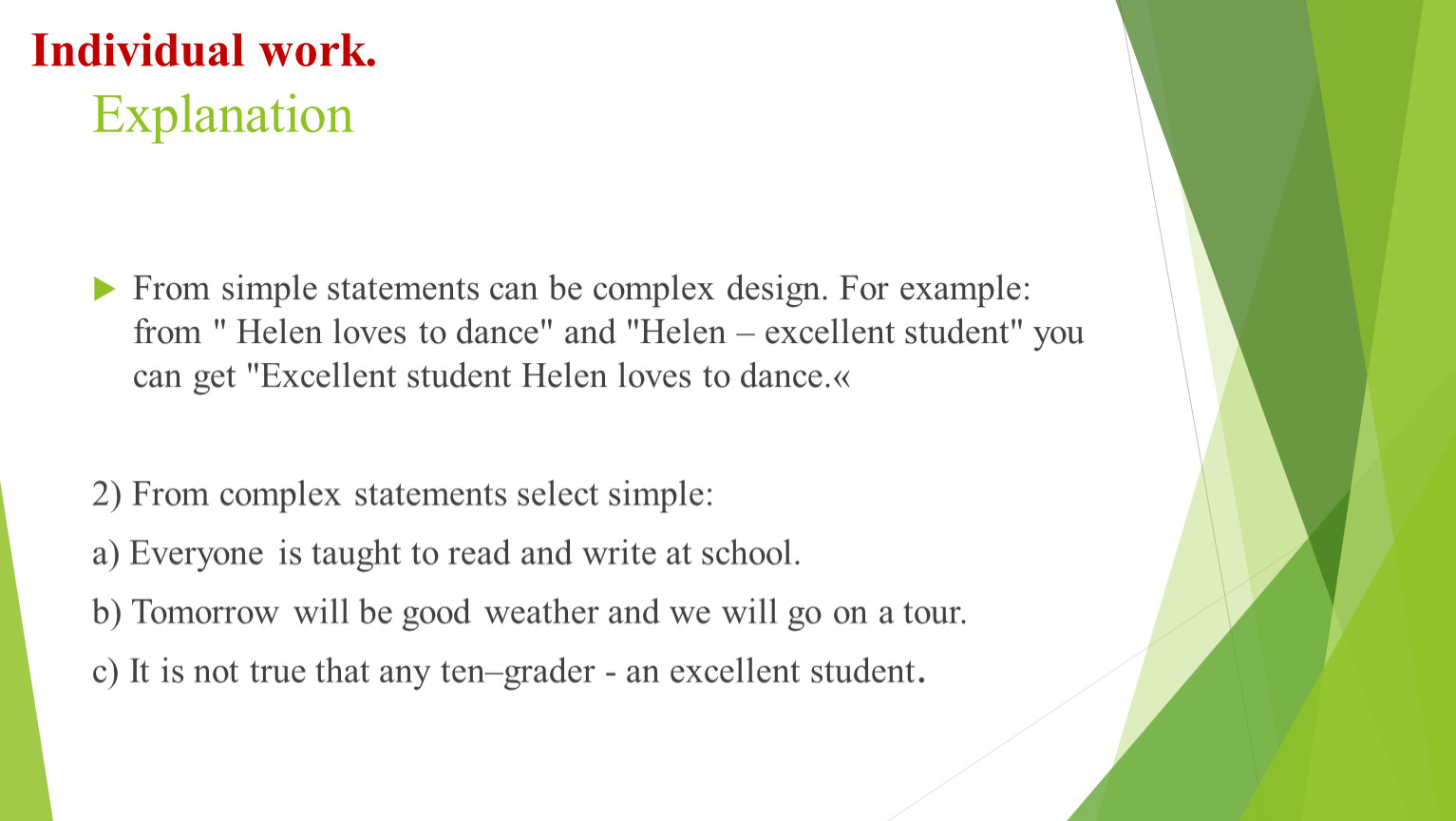 From simple statements can be complex design. For example: from " Helen loves to dance" and "Helen – excellent student" you can get "Excellent student Helen loves to dance.«