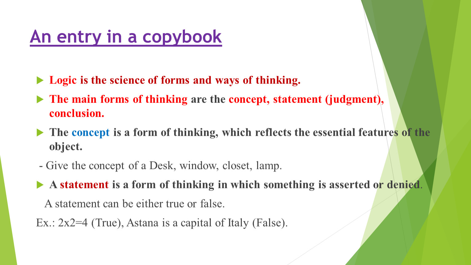 The main forms of thinking are the concept, statement (judgment), conclusion.