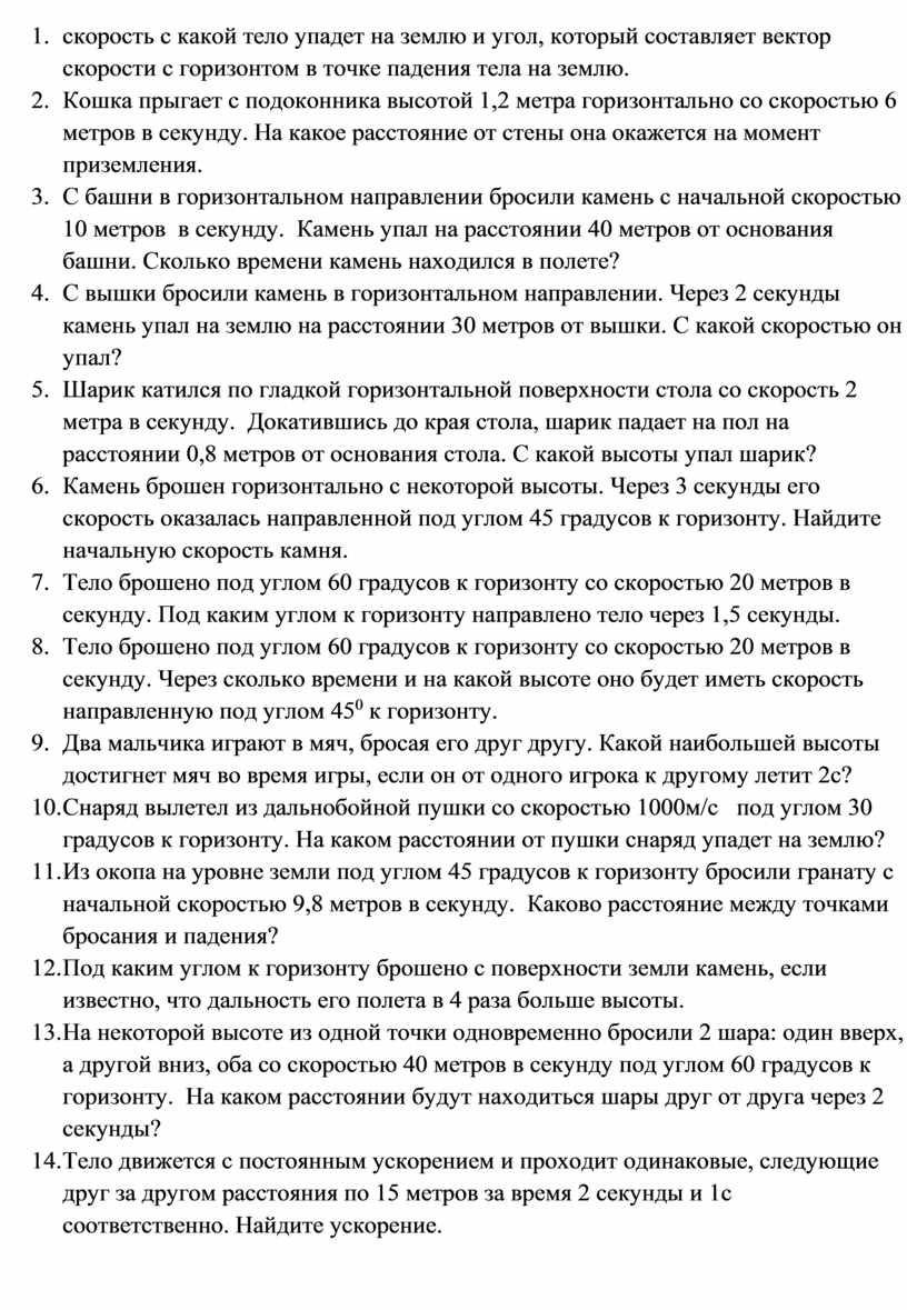 13. Кошка прыгает с подоконника высотой 1,2 метра горизонтально со скоростью 6 метров в секунду. На какое расстояние от стены она окажется на момент приземления.