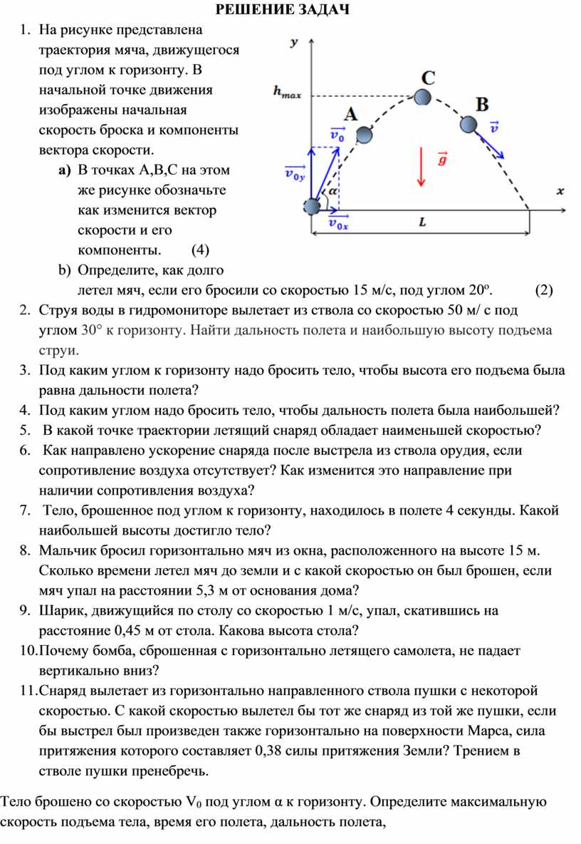 1. На рисунке представлена траектория мяча, движущегося под углом к горизонту. В начальной точке движения изображены начальная скорость броска и компоненты вектора скорости.