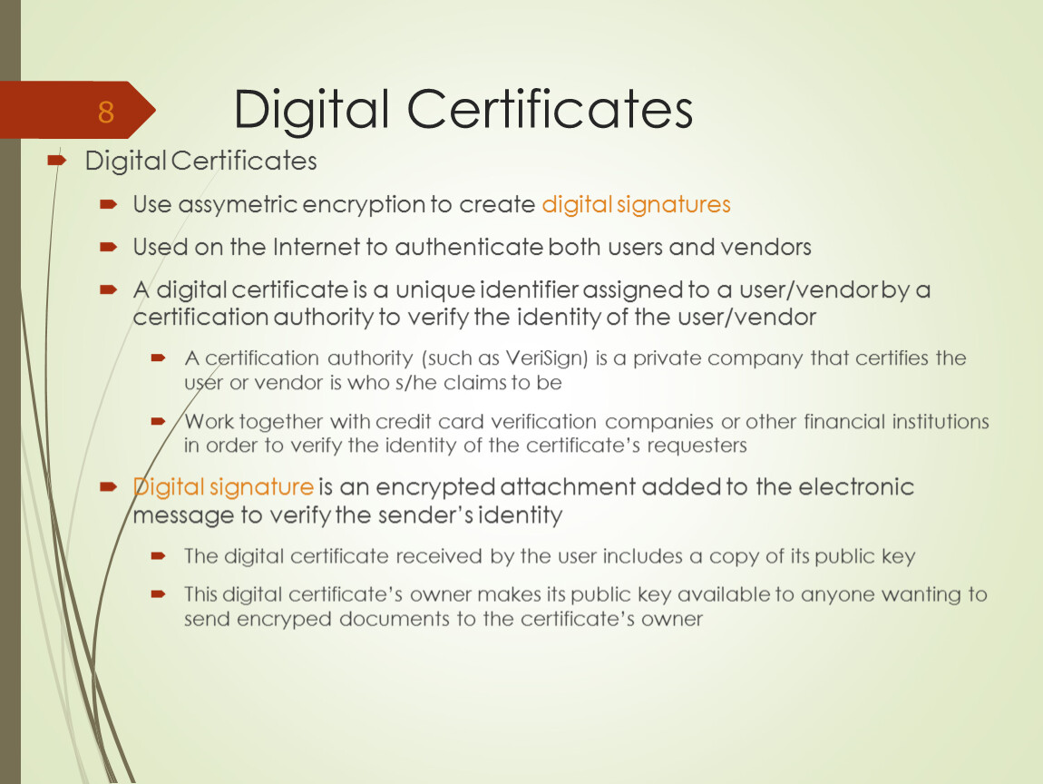 A digital certificate is a unique identifier assigned to a user/vendor by a certification authority to verify the identity of the user/vendor