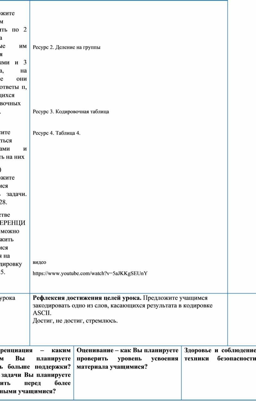 (К,О) Обсудите с учащимися, что такое кодирование и где они встречались с кодированием? Слайд 8-9 (К) Предложите учащимся разделиться на группы, например, двоичная СС, пятеричная СС, десятичная СС, восьмеричная СС, двенадцатеричная СС, шестнадцатеричная СС. Количество СС зависит от количества учащихся в группе. Ресурс 2. (Г, О) Предложите учащимся составить схему кодирования текста при помощи азбуки Морзе и проверить правильность схемы Слайд 11-12. (К, О) Предложите учащимся объяснение материала учителем о способе кодирования символов в таблице. Слайд 13-16 (Г,О,Ф) Предложите учащимся выполнить задание со слайдов 17,19,20. Предложите проверить. Раздайте группам ресурс 3. (Г,О,Ф) Предложите учащимся выполнить задание со слайда 19. Предложите проверить. Слайд 20. (Г,Ф) Раздайте группам из Ресурса 4. (только таблицу №4). Предложите обсудить в группе, что входит в альтернативную (вторую) часть таблицы ASCII. (О,К) Проведите беседу кодировок для различных ОС. слайд 21-22 (О,К) Задайте вопрос На каком языке самый большой алфавит?. Проведите беседу о недостаточности кодировки ASCII. (Г,Ф) Предложите самостоятельно изучить кодировочную систему UNICODE и представить ее на постере. Спросите у учащихся какая цель урока сегодня на уроке? С какими кодировочными таблицами они познакомились? (Г,Ф) Предложите группам презентовать свой материал. (Г,Ф) Предложите группам составить по 2 вопроса (которые им кажутся сложными и 3 вопроса, на которые они знают ответы п, касающихся кодировочных таблиц. (Г,Ф) Попросите обменяться вопросами и ответить на них (И,Г,Ф) Предложите учащимся решить задачи. Слайд 28. В качестве ДИФФЕРЕНЦИАЦИИ можно предложить учащимся задания на перекодировку Ресурс 5.